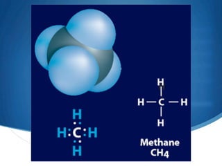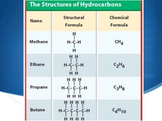 1) Carbon forms many compounds and is the main element in living things. The simplest hydrocarbon is methane, containing only carbon and hydrogen.