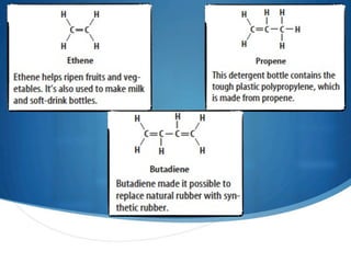 3) Unsaturated hydrocarbons, also called alkenes and alkynes, contain double or triple bonds between carbons and are not fully saturated with hydrogen. Ethene and ethyne are examples of unsaturated hydrocarbons.