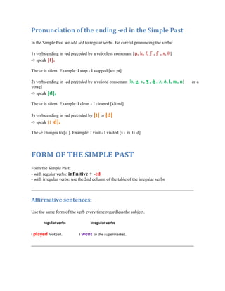 Regular verbs form the simple past by adding "-ed" to the infinitive. Some consonant doubling rules apply. Irregular verbs have unpredictable past forms that must be memorized. The simple past tense is used to talk about completed actions or situations in the past, and can be used with time expressions like "yesterday" or "last week." Questions and negatives in the simple past use the auxiliary verb "did."