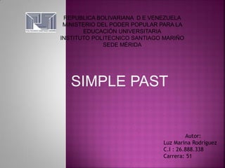 The document discusses the simple past tense in English. It defines regular and irregular verbs in the simple past. It provides examples of affirmative and negative sentences using the simple past, including with auxiliary verbs. It also discusses questions in the simple past, including yes/no questions, wh-questions, and questions using auxiliary verbs versus no auxiliary verbs.