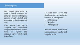 The document provides information about using the simple past tense in English. It discusses the affirmative, negative, and interrogative forms of the simple past. For the affirmative, the document explains how regular verbs are formed by adding "-ed" and irregular verbs must be memorized. For the negative and interrogative, it states that the auxiliary "did" is used except for the verb "to be". Examples are provided to illustrate the different forms using regular and irregular verbs. Common regular and irregular verbs in the simple past are also listed.