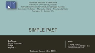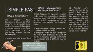 The document discusses the Simple Past tense in English. It defines the Simple Past as a verb tense used to talk about actions or events that were completed in the past. It notes that unlike Spanish, English verbs need conjugation, either regularly by adding "-ed" or irregularly by completely changing the verb form. The document outlines the different structures for affirmative, negative, and interrogative sentences in the Simple Past, including using "did" for questions and negatives. It provides examples to illustrate using regular and irregular verbs in the Simple Past.