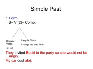 The document provides an overview of the simple past and past continuous tenses in English, detailing their forms, uses, and examples. It highlights how to construct questions and negatives for both tenses and discusses time clauses and contrasting past actions with present habits using 'used to' and 'would.' Additionally, it includes a freewriting activity and emphasizes the context of events and actions in the past.