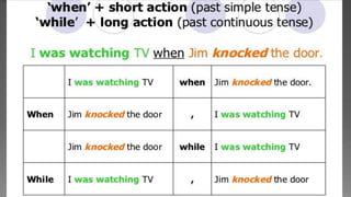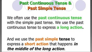 The document discusses the past continuous tense in English grammar. It defines the past continuous tense using the formula of subject - to be (was, were) - verb+ing. Examples are also provided of positive, negative and interrogative sentences using the past continuous tense with subjects I, you, we and they. The tense expresses an ongoing or continuous action that was happening at a specific time in the past.
