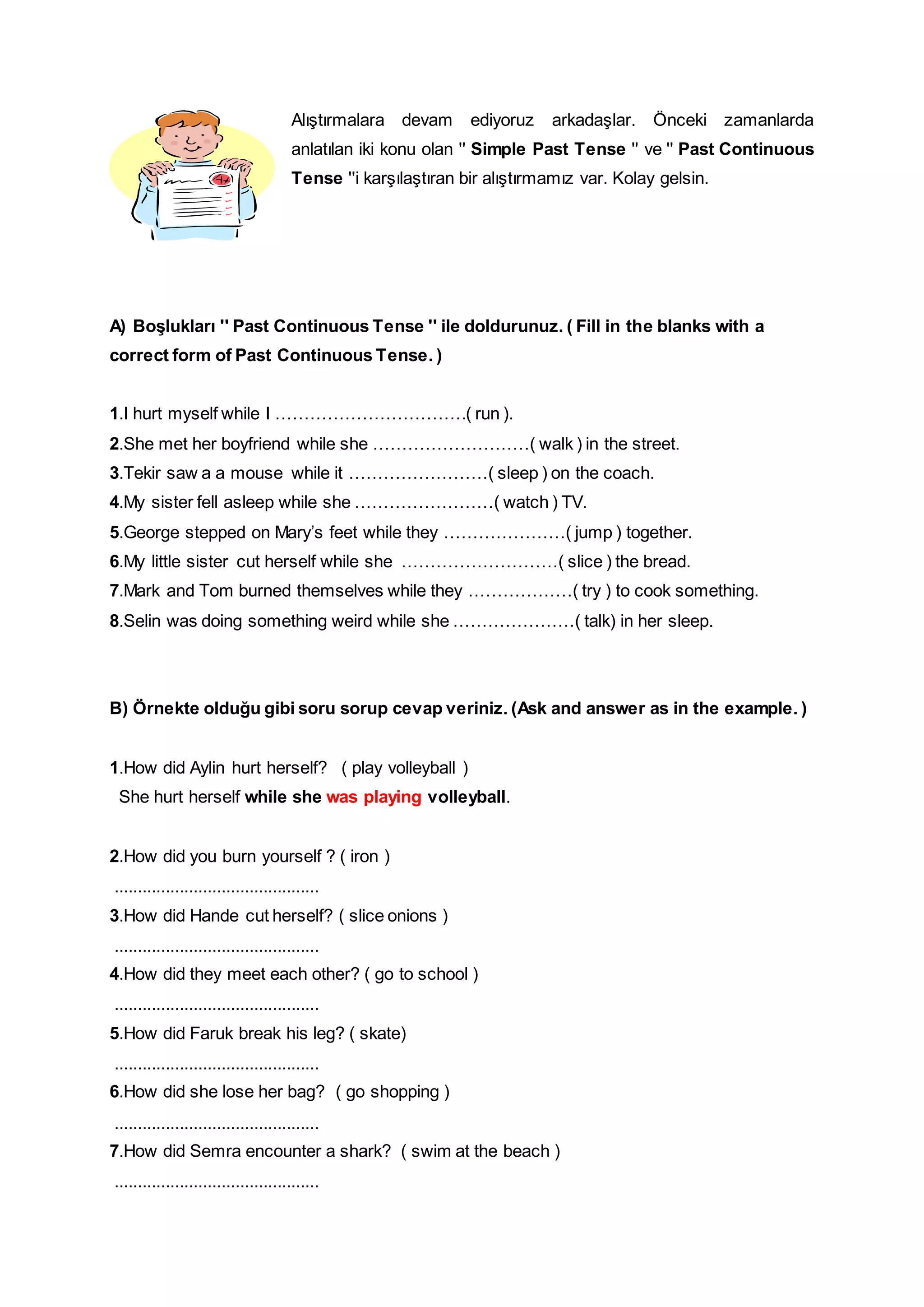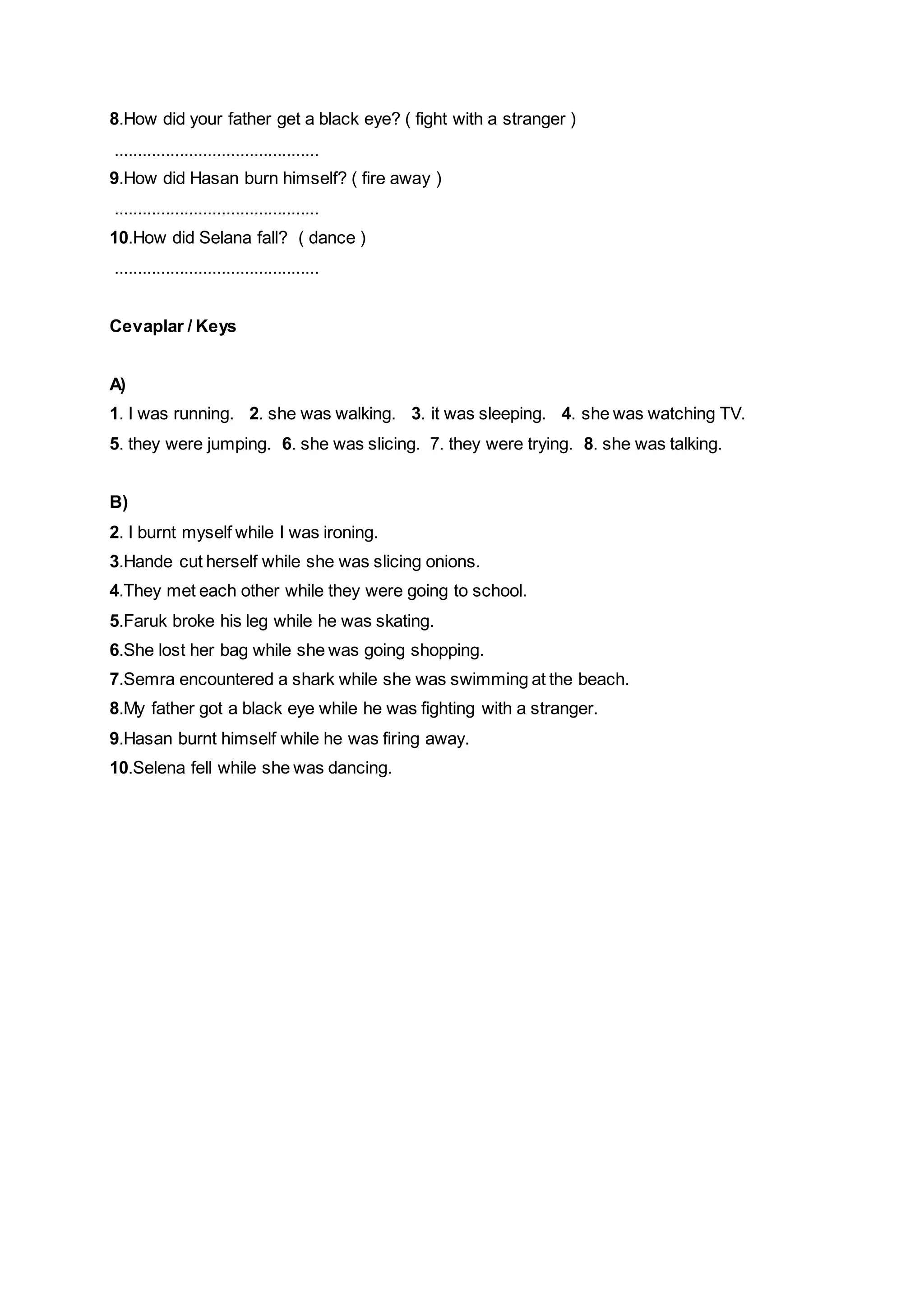 The document provides an exercise to practice the past continuous tense by filling in blanks and asking/answering example questions. For part A, students are asked to fill in 8 blanks with the past continuous form of the given verbs. For part B, students ask and answer 10 questions using the structure "How did X happen?" while providing an action in the past continuous as the answer. The keys/answers are provided.