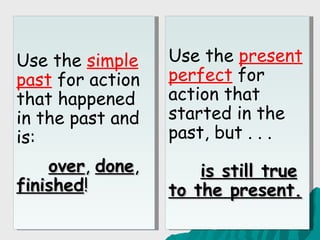 The document summarizes the difference between using the simple past and present perfect tenses in English. The simple past is used for actions completely in the past, while the present perfect connects the past to the present by describing actions that began in the past but continue to the present or may happen again. Examples are provided to illustrate when to use each, including the sentences "Sara lived in Boston for 5 years" to indicate she no longer lives there, versus "Sara has lived in Boston for 5 years" to mean she still lives there currently. Time words that typically accompany each tense are also outlined.