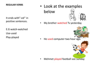 The document discusses regular and irregular verbs in the simple past tense in English. It provides examples of regular verbs formed by adding "-ed" and irregular verb forms. It also explains how to form negative sentences using "didn't" and questions using "did" + verb for both regular and irregular verbs in the past tense.