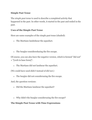 The simple past tense is used to describe a completed activity that happened in the past. It uses the past form of verbs like "walked", "talked" and includes negatives with "did not". The simple past tense is often used with time expressions like "yesterday" or "last week" to provide context about when the activity occurred or how long it lasted. There are four past tenses in English including the simple past, past progressive, past perfect, and past perfect progressive tenses.