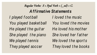 This document discusses the simple past tense structure in English. It explains that regular verbs are formed by adding "-ed" to the base verb, with some exceptions for verbs ending in "e" or "y". Irregular verbs have unique past forms that do not follow a set pattern. Examples of affirmative and negative statements are provided to demonstrate the use of both regular and irregular past tense verbs.