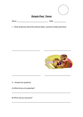 The document provides an exercise for students to practice using the simple past tense. It contains pictures for students to write sentences about in the simple past tense form. It also asks the student two questions to answer in the simple past tense, asking what they did yesterday and when they last ate pizza.