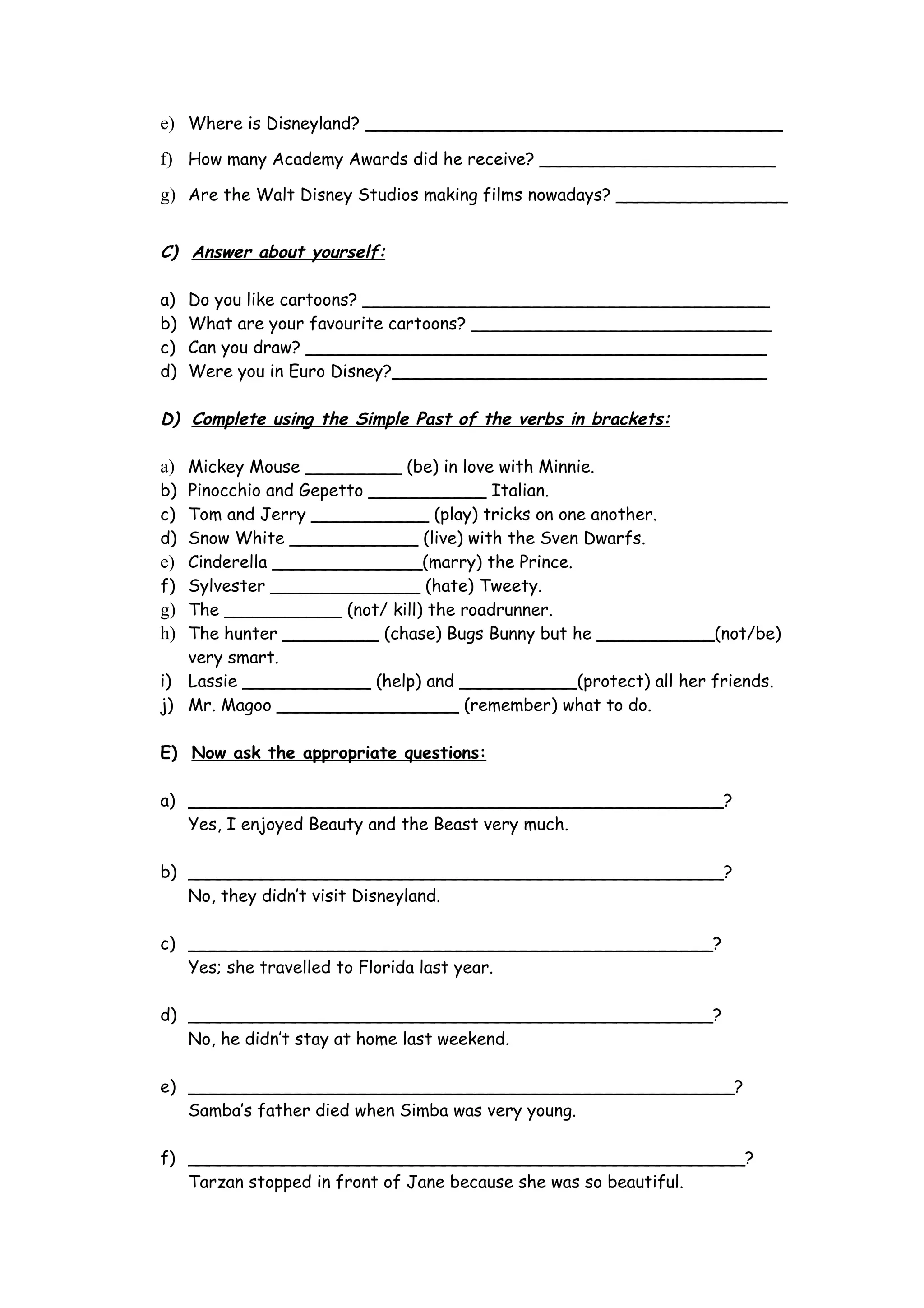 The document is a student worksheet that contains questions about Walt Disney's biography and animated films. It asks the student to answer questions about Disney's place of birth, early drawings, when he became a cartoon artist, the location of Disneyland, and the number of Academy Awards he received. Additionally, it contains exercises asking the student about their favorite cartoons, drawing ability, and a past trip to Disneyland. In sections D through F, the student is tasked with completing sentences in simple past tense about Disney characters and describing their previous day.