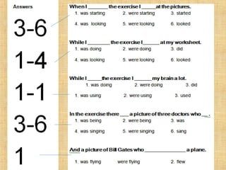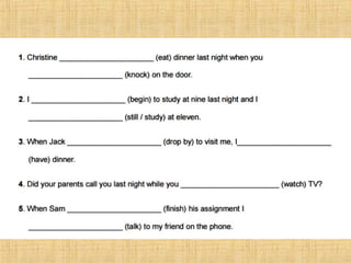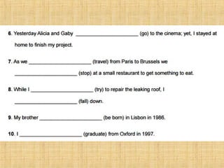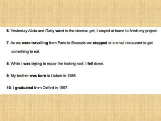 The document summarizes the difference between the simple past and past continuous tenses in English grammar. It provides examples of how to use each tense properly. The simple past is used for actions completed in the past, while the past continuous is used for actions that were ongoing or in progress at a specific time in the past. It also notes that stative verbs like "know" and "like" are not typically used in the past continuous tense.