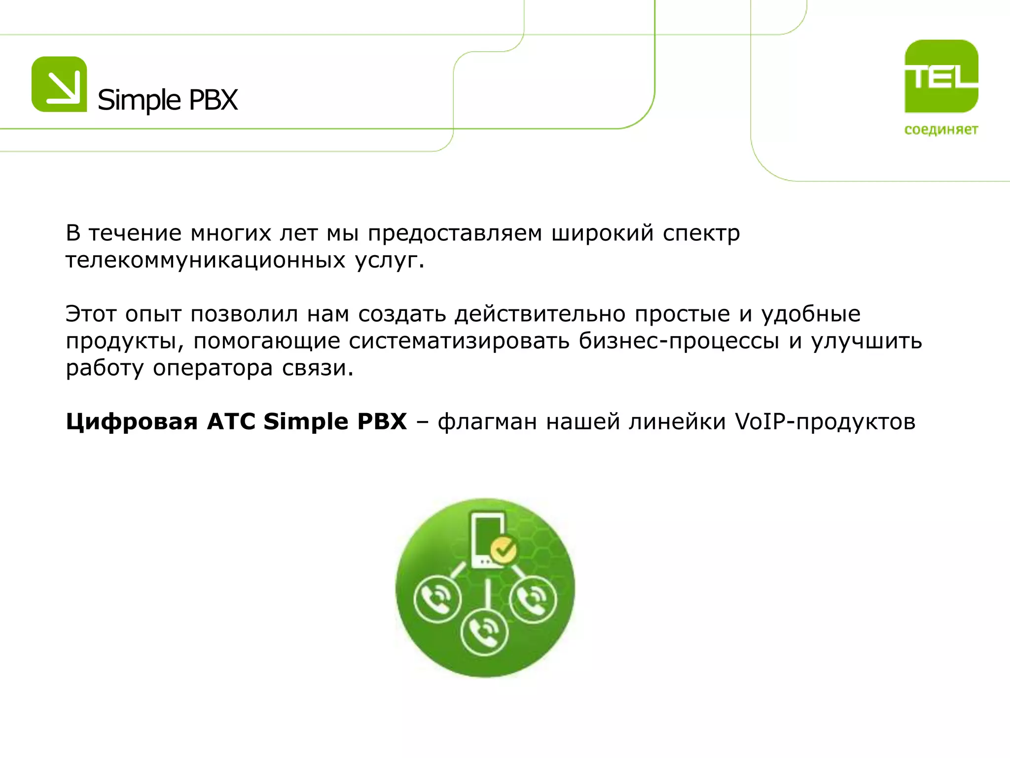 Документ описывает telecommunication service and IP-PBX solutions offered by Simple PBX, emphasizing the ease of integration and scalability of their VOIP products. It highlights key features like unlimited internal subscribers, IVR systems, call recording, and integration with corporate CRM and ERP systems. Additionally, it provides technical details about the architecture and performance capabilities of the Simple PBX system.