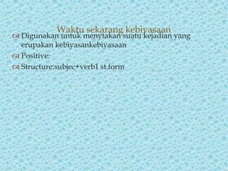 The document discusses the simple present tense in English. It provides examples of positive sentences using the simple present tense structure of subject + verb in first form. Negative sentences are formed using the structure of subject + do/does not + verb first form. Examples are given for both positive and negative simple present tense sentences, including questions formed with do/does and short answers of yes/no.