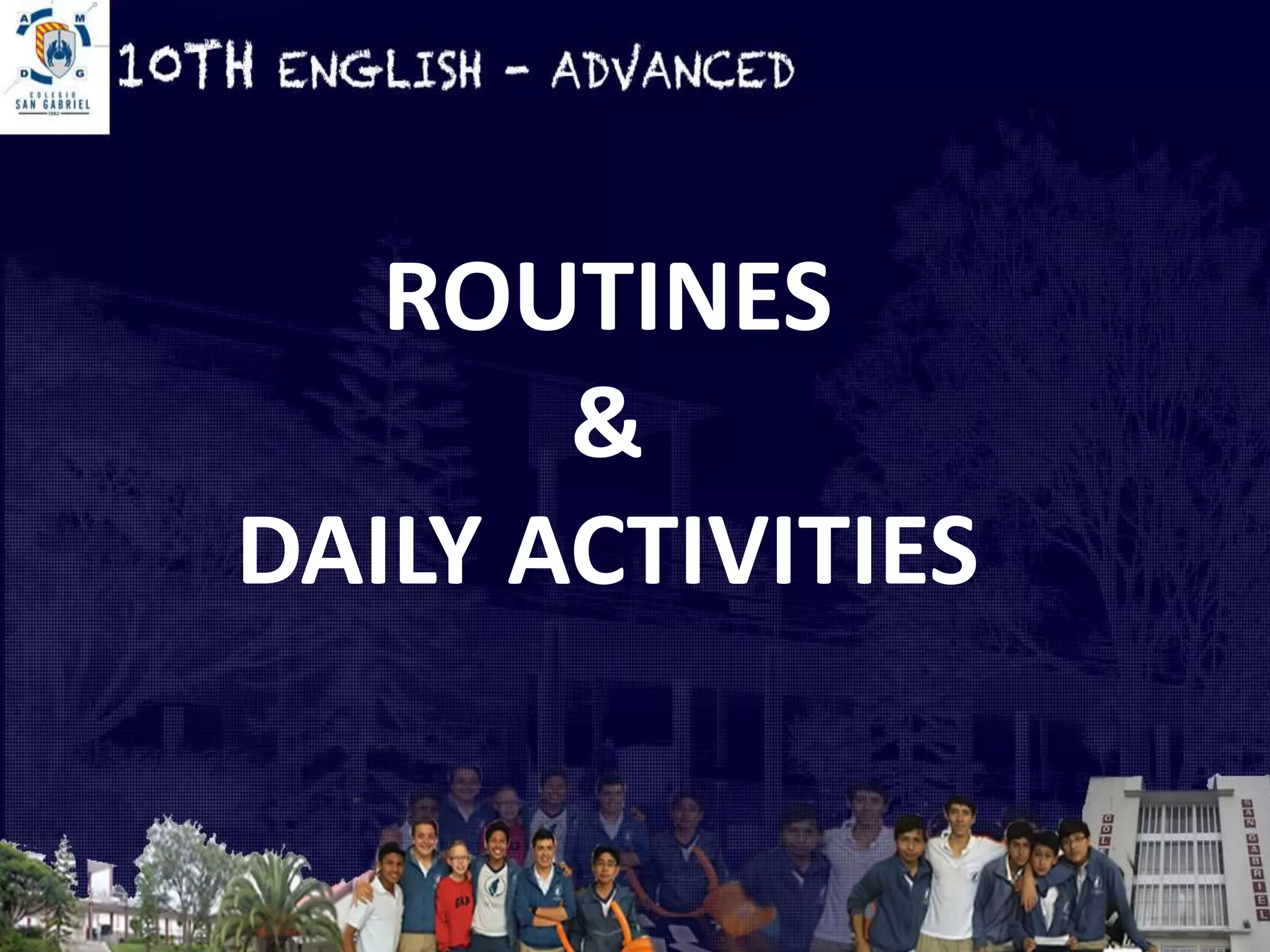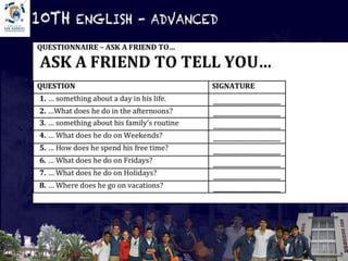This document discusses routines and daily activities. It provides examples of questions about a person's regular schedule and habits, such as what they do in the morning and afternoon. It also includes short statements about going to the park everyday and painting or cutting flowers at the moment. The document finishes with a quiz about routines and temporary situations where sentences need to be completed with the correct verb forms.