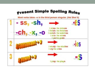 The document discusses the simple present tense in English. It notes that the simple present is used to tell the truth, describe daily activities, and discuss future time. It provides the patterns for affirmative, negative, and interrogative sentences in the simple present. Examples are given showing how to conjugate verbs based on subjects like "I", "you", "we", and third person singular subjects like "he", "she", and "it". Adverbs of frequency that can be used with the simple present are also listed.