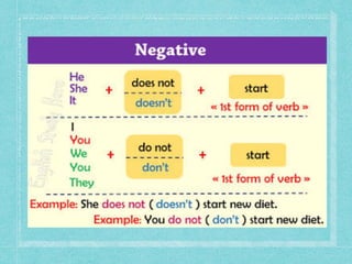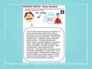 This document provides examples of simple present tense verbs and questions about daily routines and activities. It asks the reader to describe an activity they did, provides examples of simple present tense sentences using "I" and "she", examples of yes/no questions and responses in simple present tense, and prompts the reader with questions about their morning routine, free time activities, residence, profession, place of study, and bedtime using simple present tense.