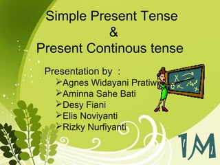 Presentasi ini membahas tentang Simple Present Tense dan Present Continuous Tense. Simple Present Tense digunakan untuk menyatakan kebiasaan dan fakta yang terjadi secara berulang, sedangkan Present Continuous Tense digunakan untuk menyatakan suatu aktivitas yang sedang berlangsung saat ini. Perbedaan utama antara keduanya adalah Present Continuous Tense menekankan pada aktivitas yang sedang berlangsung, sedangkan Simple Present Tense menekankan pada aktivitas yang terjadi berulang kali.
