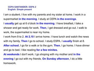 Mary gets up at 7 o'clock in the morning. She works at a supermarket from 9 to 2 and then studies ESPA at CEPA in the evenings, usually finishing at 8. On weekends, she goes shopping with her mother or goes out with friends in the evening.