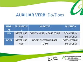 This document provides information about simple present tense verbs in English. It defines the simple present tense as describing routines and facts. It lists the auxiliary verbs "do" and "does" and provides the affirmative, negative, and question forms. It gives formulas for constructing sentences using different pronouns. Examples are provided to demonstrate adding "-s" to verbs in third person sentences. Exercises at the end test forming sentences in the simple present tense using different pronouns. Formulas are also given for asking wh- questions using auxiliary verbs and subjects.