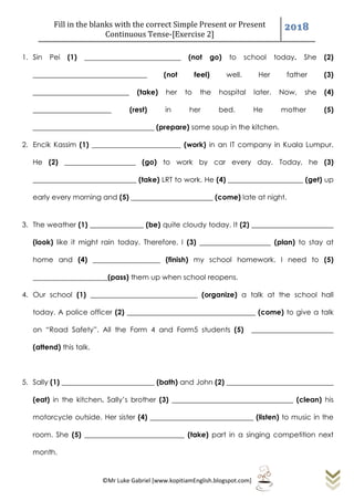 The document provides an exercise to fill in blanks with the correct simple present or present continuous tense. It includes 5 sentences with blanks that require verbs to be filled in with the appropriate tense. The sample answer fills in each blank with a verb conjugated to the simple present or present continuous tense to correctly complete each sentence.