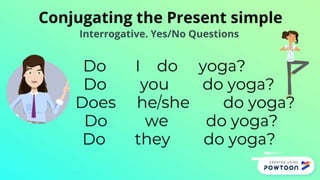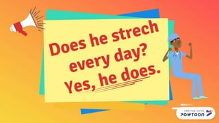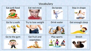 The document provides vocabulary words related to health, exercise, and diet. It then instructs students to practice using the vocabulary words to make true sentences about themselves in simple present tense. Students are told to ask and answer yes/no questions about each other's sentences using "Do/Does" questions. Finally, it provides examples of yes/no questions for students to practice asking each other.