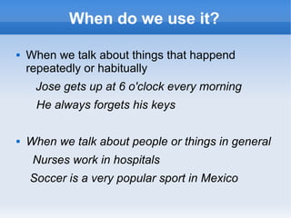 The document discusses the simple present tense in English. It explains that the simple present tense is used to talk about habitual or repeated actions, permanent situations, general truths, and future plans. It provides examples of affirmative, negative, and interrogative sentence structures in the simple present tense and notes about forming verbs. Exercises are included to practice forming sentences in the simple present tense.