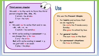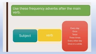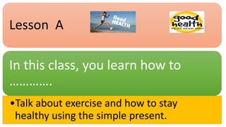 This document provides a lesson on using the simple present tense to talk about exercise and staying healthy. It includes lists of nouns and verbs related to these topics. It then explains how to form sentences in the simple present tense using subjects, verbs and adverbs of frequency. Examples are given of asking and answering questions about exercise habits using the simple present tense. The document concludes with an oral practice activity asking students to ask and answer questions about each other's exercise routines and healthy habits using the simple present tense forms.