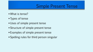 The document explains the simple present tense, its structure, and various uses such as stating universal truths, scientific facts, and daily routines. It provides examples and outlines specific spelling rules for the third person singular form. Additionally, time expressions commonly used with the simple present tense are mentioned.