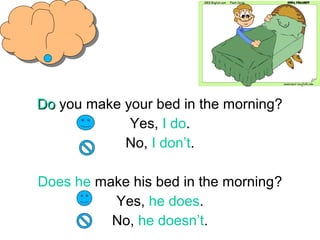 The document provides examples of simple present tense questions and statements in English. It shows yes/no questions using auxiliary verbs like "do" and "does" followed by the subject and main verb. Statements are also given as examples. Wh-questions using auxiliary verbs and changing the word order are demonstrated. Finally, there are exercises asking the reader to fill in blanks with simple present verbs and an exercise matching questions with answers.