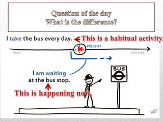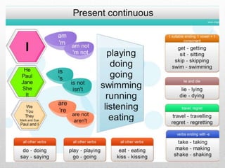 The document summarizes the differences between the simple present and present continuous tenses in English. It provides examples of their sentence structures and usage. The simple present is used for habitual or repeated actions, facts, and schedules. It uses signal words like "always" and days/times. The present continuous emphasizes a temporary action happening at the time of speaking and uses words like "now" and "these days." Examples are given of affirmative, negative, and interrogative sentences in both tenses. Readers are directed to a website for more information on tenses.