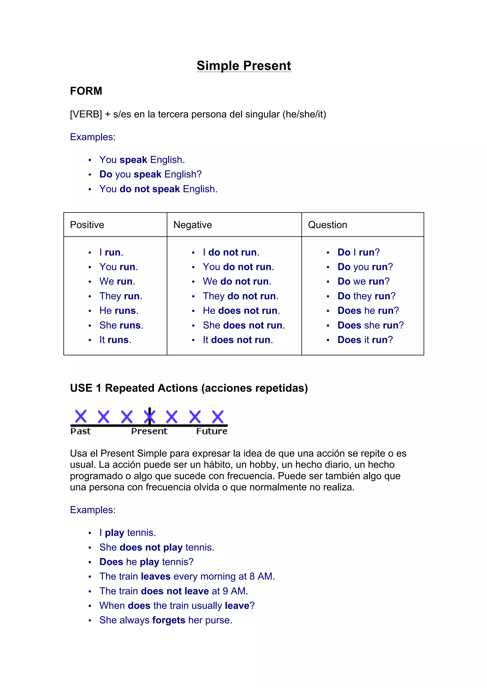 For the simple present, it describes its use for repeated or habitual actions, facts/generalizations, and scheduled near future events. Examples are provided for positive, negative and interrogative forms.