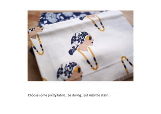 This document provides instructions for making a simple project tote bag for carrying yarn and craft projects. The instructions involve selecting a plastic container, tracing its base onto fabric, cutting circles and rectangles from the fabric, and sewing them together to form a bag that can be placed inside the container. Once assembled, the bag is weighted with rice and has drawstrings added to its top opening to secure items inside and allow for easy carrying. The finished tote keeps yarn and projects organized and protected from dust.
