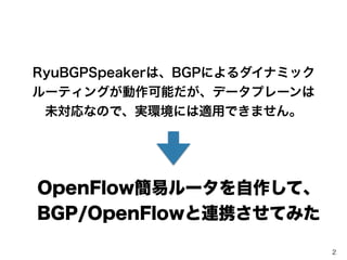The document describes an experiment using RyuBGPSpeaker to create a simple OpenFlow router that integrates BGP and OpenFlow routing. The author first tests connecting an OpenFlow switch to RyuBGPSpeaker to inject BGP learned prefixes into the switch's flow table. Then, the author improves the design by running the OpenFlow switch and Ryu controller on the same Linux machine to avoid adding cables for each new BGP peer. The experiment confirms basic routing works as expected, with routes converging again within a minute if the BGP network is interrupted.