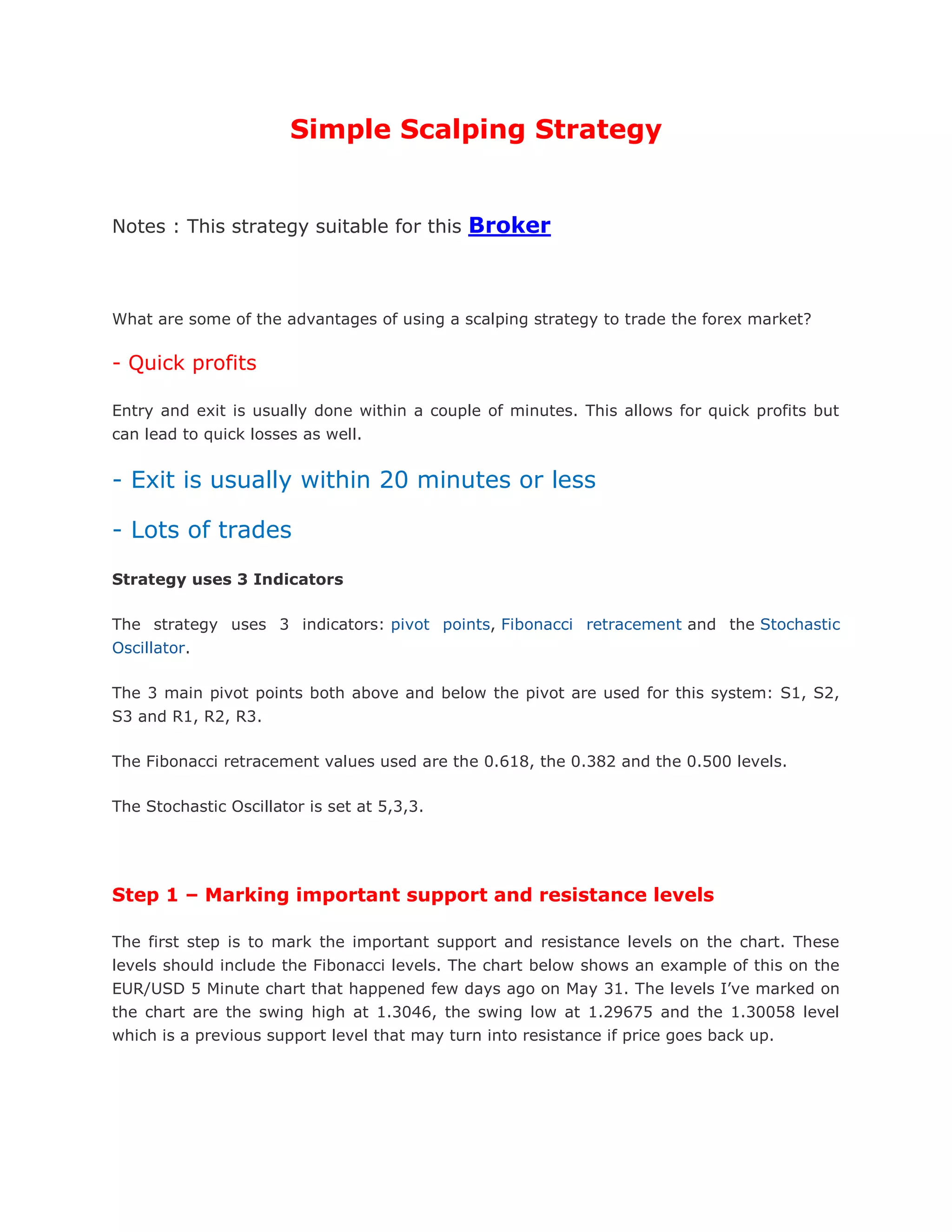 This document outlines a simple scalping strategy for trading the forex market, emphasizing quick profits through rapid entry and exit, typically within 20 minutes. It employs three indicators—pivot points, Fibonacci retracement, and the stochastic oscillator—while detailing the process of marking support and resistance levels, entering and exiting trades based on the stochastic oscillator's signals, and seeking confluence for higher quality trades. The strategy includes specific examples using the EUR/USD 5-minute chart to illustrate trade entries and exits effectively.