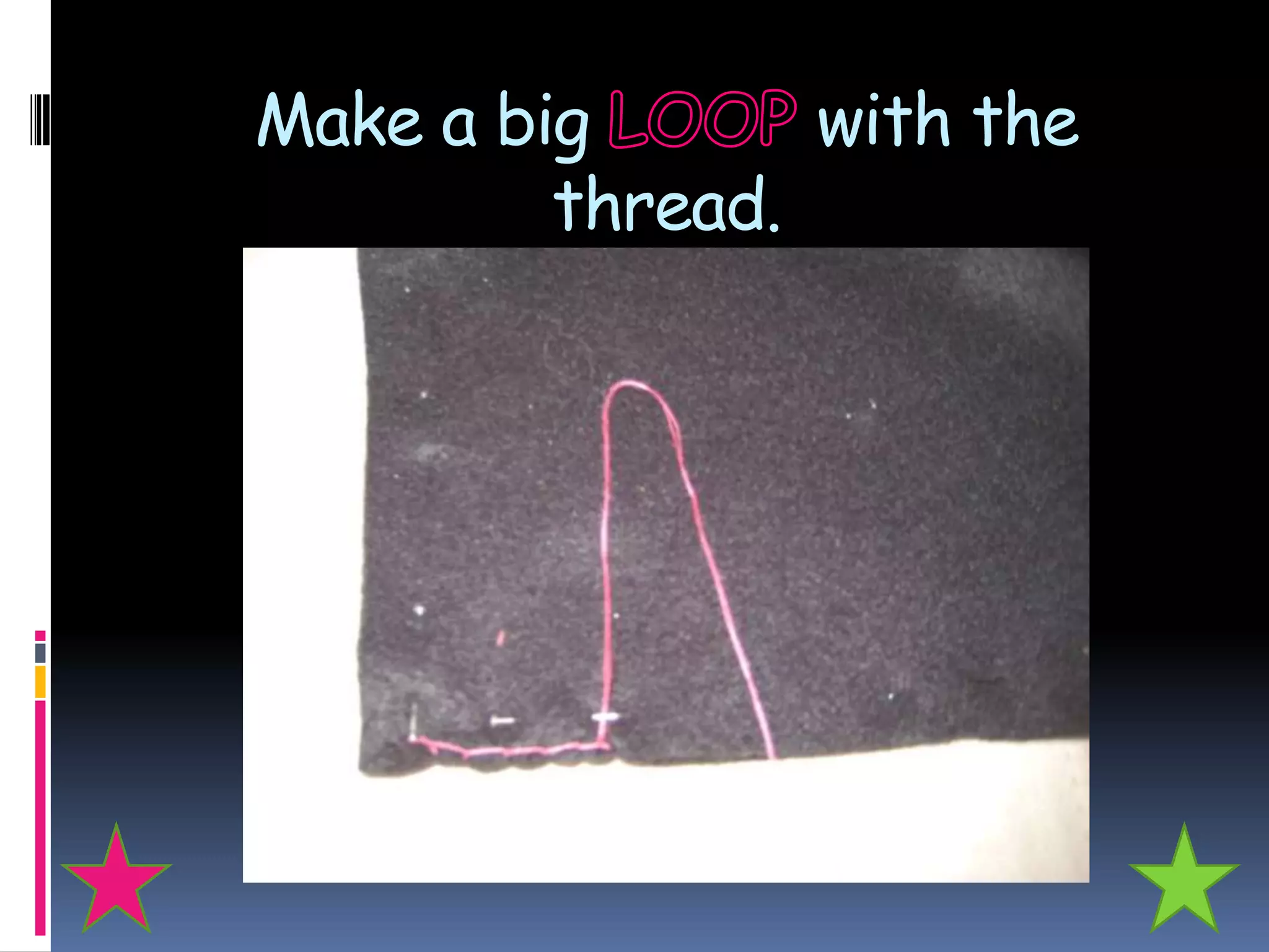 This document provides a 4-step process for sewing taught by Ms. Stark: 1) Make a large loop with thread, 2) Insert the needle from the bottom close to the last stitch, 3) Pull the loop close to the needle so it encircles it, 4) Push the needle through the fabric and give a gentle tug to tighten the stitch without yanking. The steps are illustrated through interactive slides.