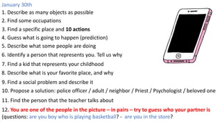 The document contains the agenda for an English class that will cover various grammar and language skills. The agenda includes activities like interpretation, design and painting, paraphrasing words into categories with colors, role playing questions, exploring an online language learning website, subscribing to the website, sharing the unit syllabus, and doing a self-assessment. It also provides example texts and conversations for some of the listening, writing, and role playing activities.