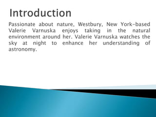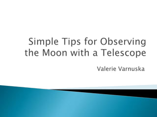 Valerie Varnuska from Westbury, New York enjoys nature and watching the night sky to learn astronomy. The document provides tips for using a telescope to observe the moon, including reducing light entering the telescope, using a lunar map to identify features, and viewing the moon when it is half-illuminated shortly after the first quarter phase.