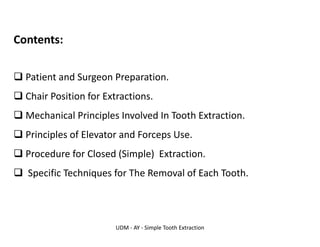 The document outlines the procedure and principles of simple tooth extraction, including patient and surgeon preparation, positioning during the procedure, and the mechanical principles involved. It emphasizes the importance of correct chair positioning for both maxillary and mandibular extractions, the proper use of elevators and forceps, and detailed steps for performing an atraumatic extraction. Specific techniques for removing various types of teeth are also discussed, highlighting the role of the assistant and the importance of minimizing trauma during the extraction process.