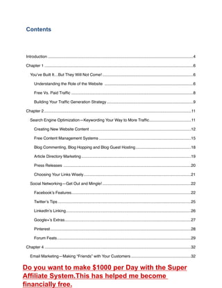 The document is a guide to generating web traffic through various strategies, emphasizing the importance of content creation, SEO, and targeted marketing over paid traffic methods. It highlights the misconceptions about website visibility and outlines a structured approach for website owners to attract visitors organically. The author shares proven techniques for traffic generation that do not rely on expensive advertising or Google algorithms.
