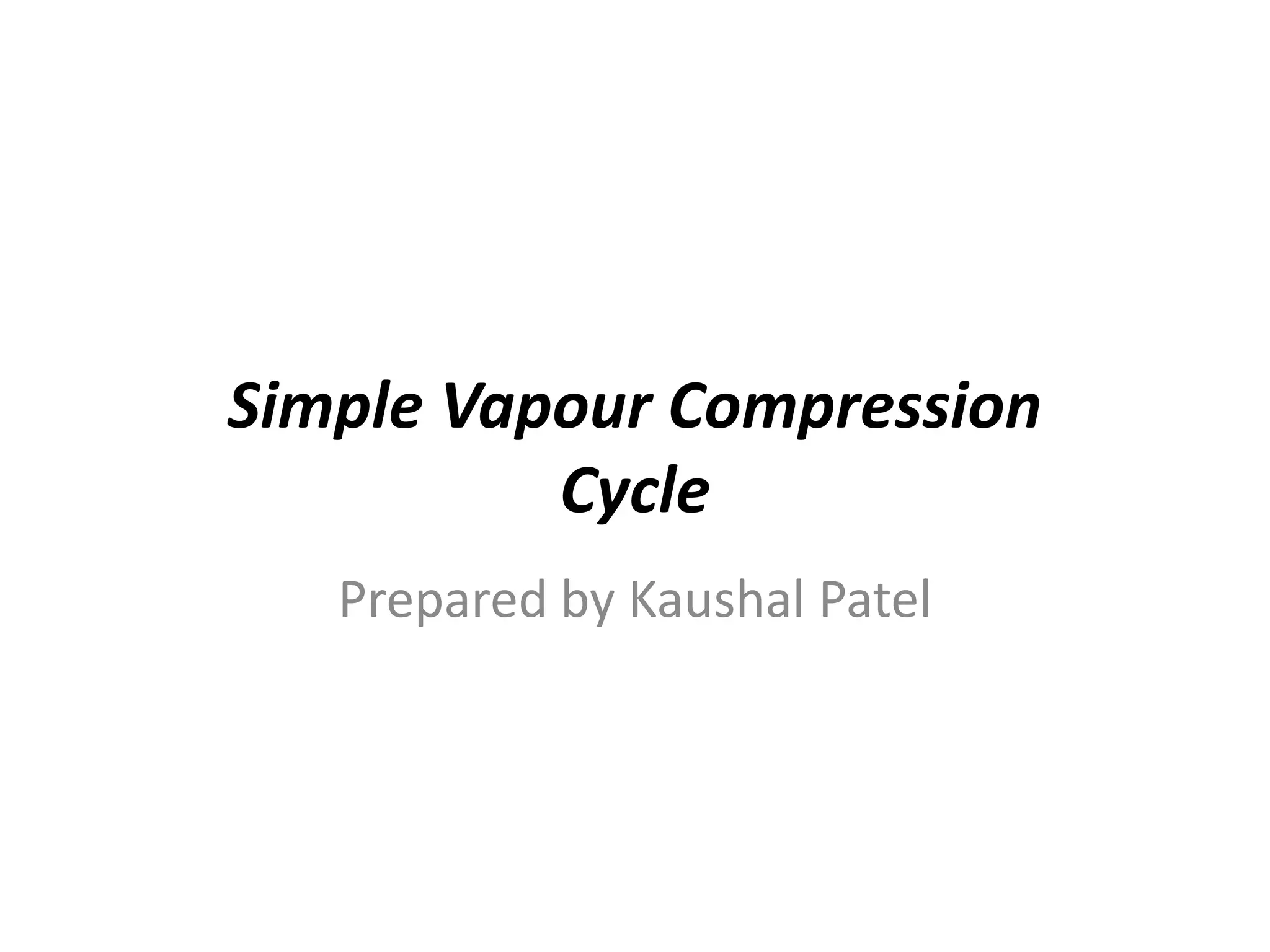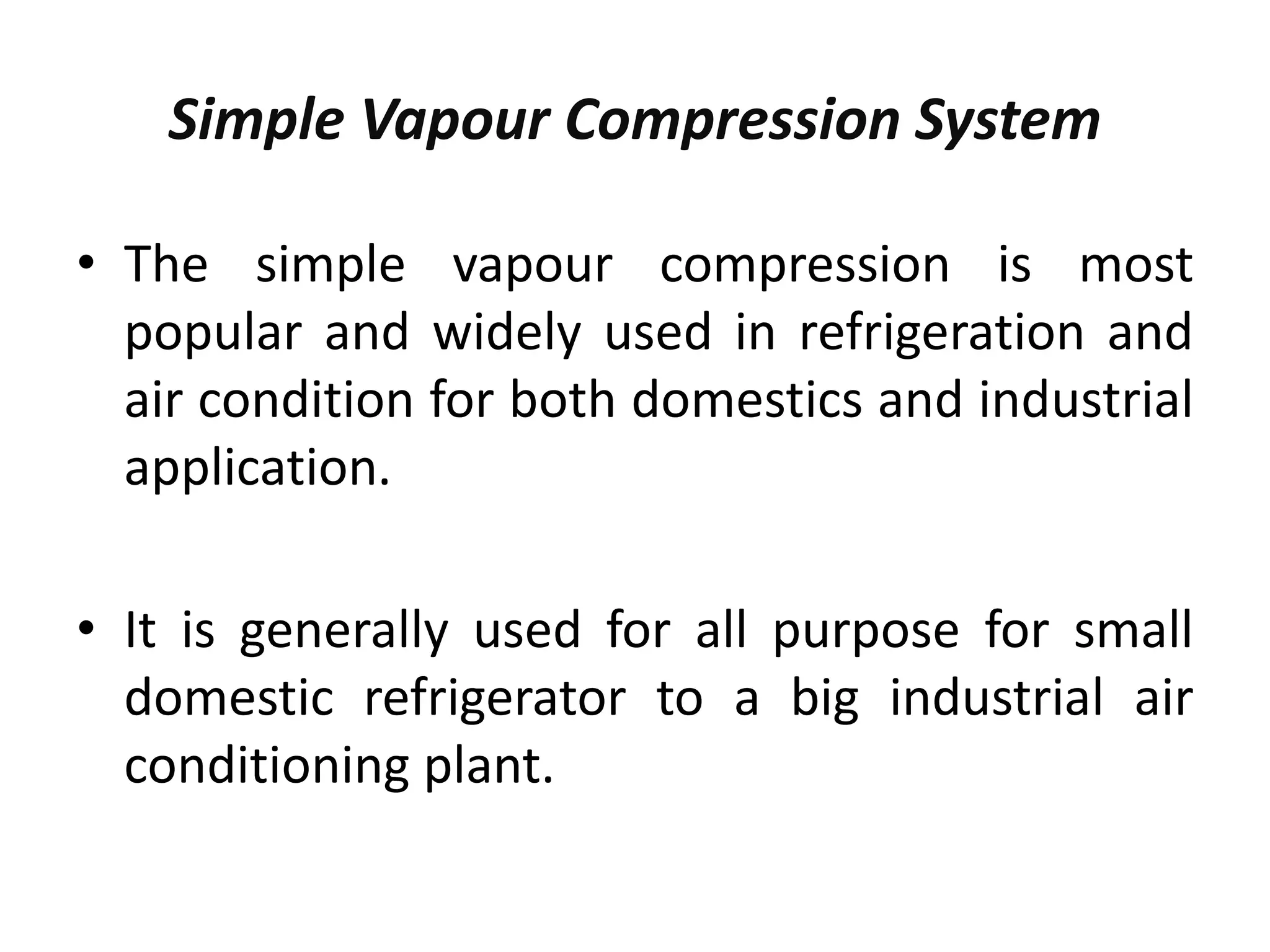The simple vapour compression cycle is a highly utilized refrigeration system for both domestic and industrial applications, employing a refrigerant that condenses and evaporates near atmospheric conditions. It offers advantages such as smaller size, lower running costs, and high coefficient of performance, but has drawbacks including high initial costs and leakage prevention challenges. The system consists of four main components: evaporator, compressor, condenser, and expansion valve, and involves specific processes for refrigerant evaporation, compression, condensation, and expansion.