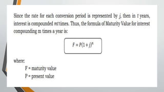 This document discusses simple and compound interest. Simple interest is calculated on the principal only, while compound interest is calculated on the principal and accumulated interest over time. The key formulas for simple interest are presented, along with examples of calculating simple interest for scenarios like deposits, loans, and investments. Compound interest is explained as interest earned on both the principal and past interest. Formulas and examples are provided for calculating compound interest accrued over time at different compounding periods.