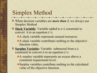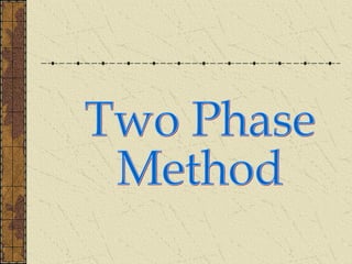 The document describes the two phase simplex method for solving linear programming problems (LPP) with greater than or equal to constraints. In phase I, an auxiliary LPP is constructed by introducing artificial variables and slack/surplus variables. The objective is to minimize the artificial variables using the simplex method. If an artificial variable is positive or zero in the optimal basis, phase II is executed to solve the original LPP. Phase I provides a starting feasible solution for phase II to obtain the actual optimal solution.
