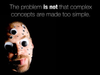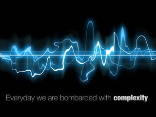 The document discusses the concept of simplicity. It states that simplicity is rare but not simple to achieve. It provides examples of simple, intuitive designs from Apple and Google Search. It then discusses how simplicity can be realized through thoughtful reduction of functionality without penalty. It also notes that organization can make complex systems appear simpler by sorting, labeling, integrating and prioritizing items. The document outlines five laws of simplicity according to author John Maeda: 1) thoughtful reduction, 2) organization, 3) time savings feel like simplicity, 4) knowledge makes things simpler, and 5) some things can never be simple. It concludes that simplicity is about subtracting the obvious and adding the meaningful.
