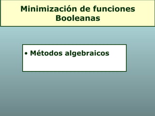 1. Algebraic methods such as identities, factorization, distribution, consensus theorem, and De Morgan's theorem.