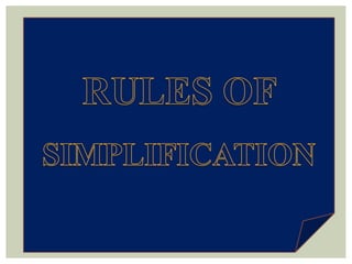 This document discusses rules for simplifying mathematical expressions. It explains that "of" should be replaced with multiplication and "divided by" should be replaced with division. It also emphasizes following the order of operations using VBODMAS (Vincules, Brackets, Of, Division, Multiplication, Addition, Subtraction). Some additional rules covered include performing the operation on the left first if of equal precedence, and rounding decimal numbers to the nearest integer when simplifying expressions.