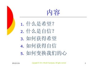 1. 什么是希望? 2. 什么是自信? 3. 如何获得希望 4. 如何获得自信 5. 如何变换我们的心 2012/1/16 Tsuchiyama. Copyright © 2011, Hitoshi Tsuchiyama. All rights reserved. 2
