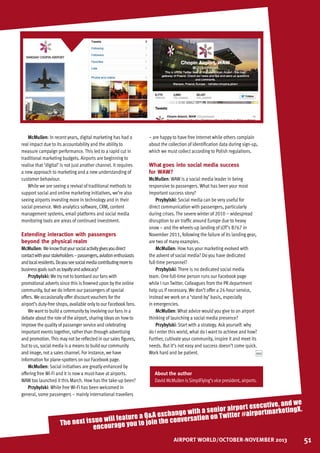The document discusses the evolving role of social media and marketing strategies at airports, emphasizing the need for a clear business plan and community engagement in this digital age. It highlights Warsaw Chopin Airport's approach to differentiating its marketing from competitors, focusing on both business and non-aviation services while valuing traditional marketing methods alongside digital strategies. The conversation also includes insights on the importance of passenger interaction, crisis communication, and the strategic development of airport marketing to build community and enhance passenger experience.