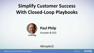 The document discusses the concept of customer success using closed-loop playbooks, emphasizing the need for a command center to manage customer success processes that are people-intensive and conversational. It argues that standard business process automation is inadequate for customer success, which requires flexibility and adaptability instead. The presentation also introduces customer sensors to monitor customer engagement, outcomes, and trends to optimize the customer journey.