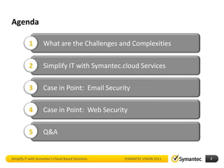 This document discusses how Symantec's cloud-based solutions can simplify IT management. It outlines common IT challenges like limited resources, complexity from multiple vendors and products, and evolving security threats. The presentation then describes Symantec's cloud portfolio including email, web and endpoint security services. These services offer benefits like simple deployment, automatic updates, scalability and pay-as-you-go pricing. Case studies are provided showing how Symantec.cloud solutions helped Arnold Worldwide and Perkins Eastman improve security and productivity while reducing IT workload and costs. In conclusion, Symantec's cloud services can help organizations simplify IT by addressing challenges, providing a single vendor solution and protecting against evolving threats.